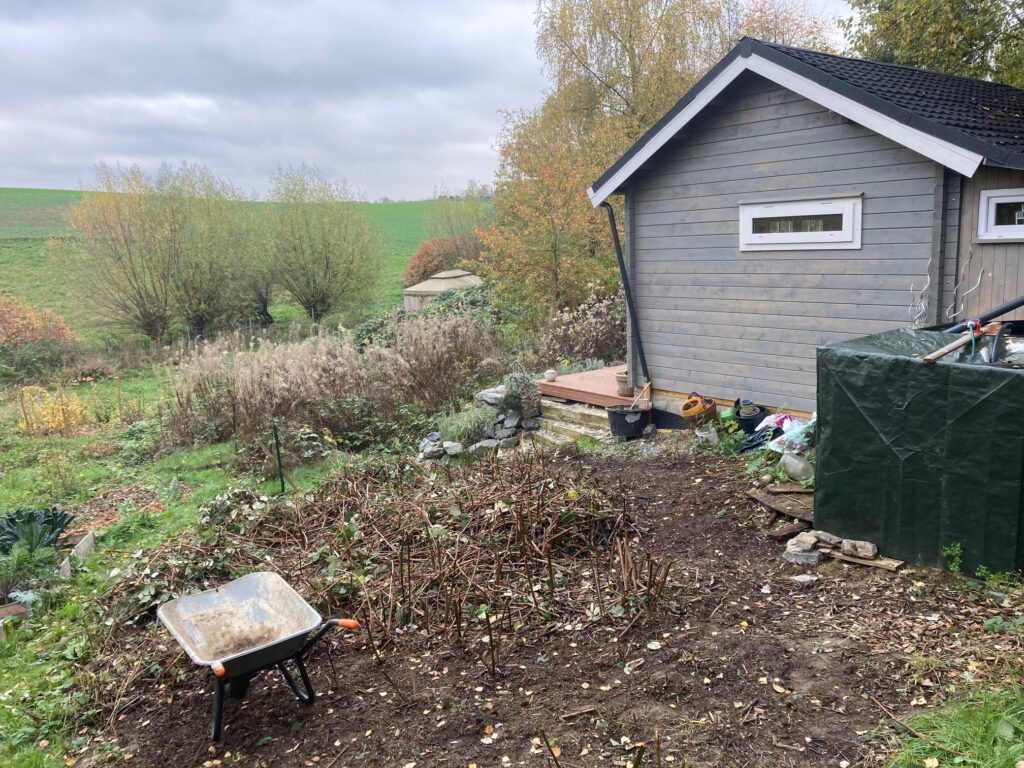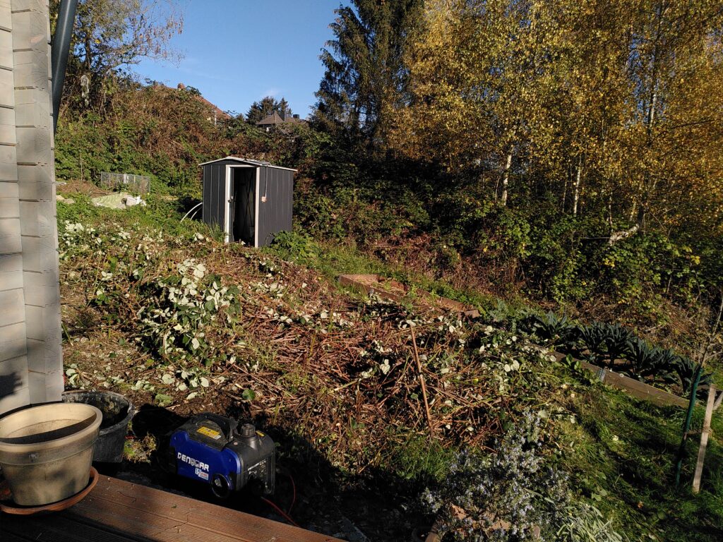 Damit wir an den Aufbau des Gewächshauses überhaupt denken können, muss natürlich mal wieder erst mal für Platz gesorgt werden. Das bedeutet einmal mehr Brombeeren schneiden und Wurzeln ausgraben. Den ersten Teil davon haben wir schon geschafft. Das Gewächshaus wird unweit vom Haus stehen, an einer Stelle wo es viel Sonne bekommt und wir trotzdem recht einfach Wasser hinlegen können. Wenn wir uns um die Brombeeren gekümmert haben, müssen wir dann erst noch die notwendige Größe (knapp 10 m2) terrassieren um eine ebene Fläche hinzubekommen, ähnlich wie beim Gartenhaus auch, nur eben kleiner und etwas weniger aufwändig. Das wird noch einiges an Arbeit, aber am Ende werden wir dann die Möglichkeit haben, Gemüse drinnen anzubauen (und dafür die Saison deutlich zu verlängern) und auch Töpfe zu überwintern.
