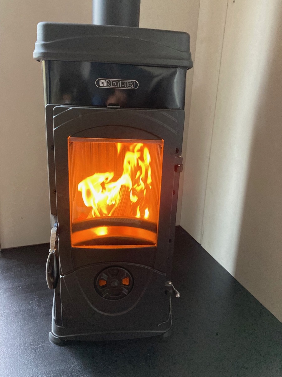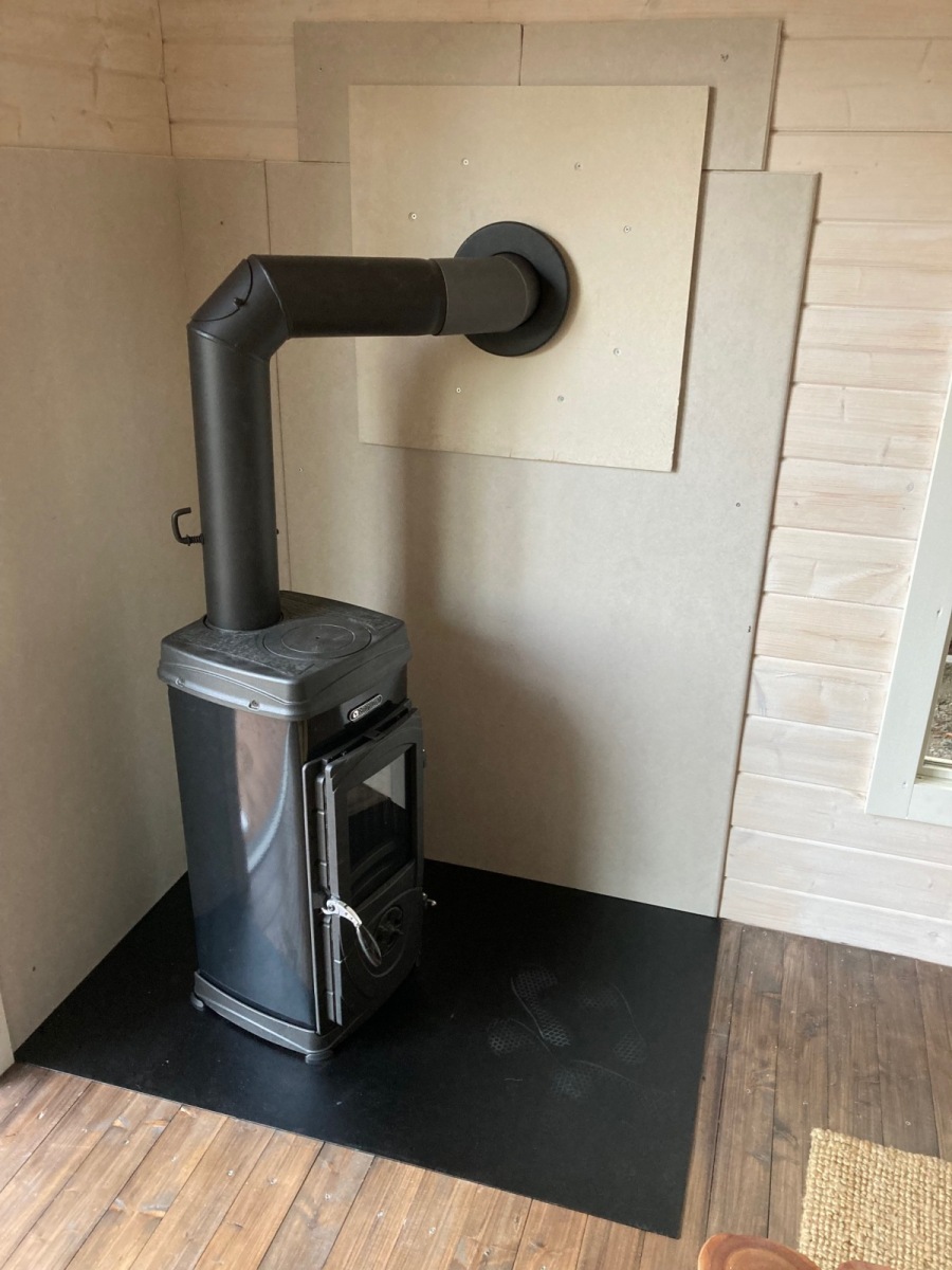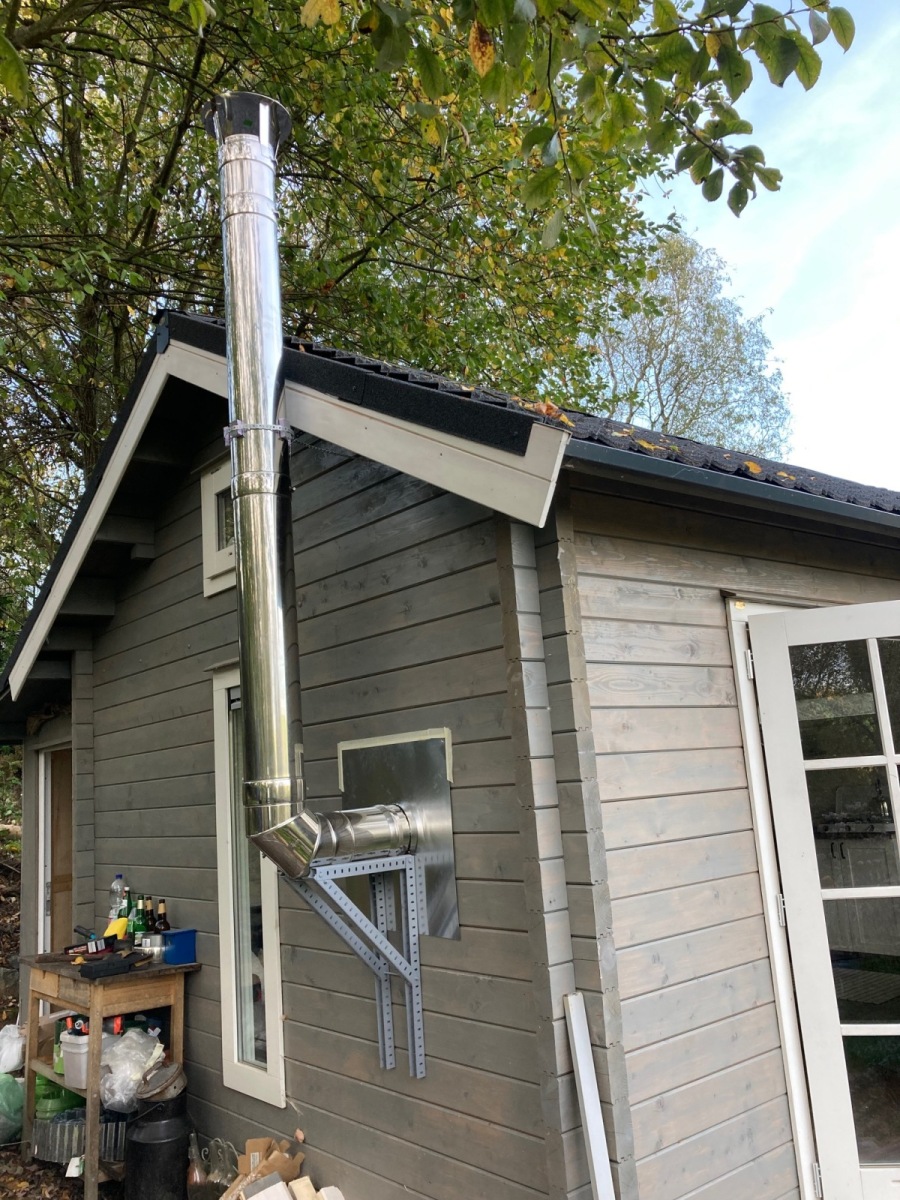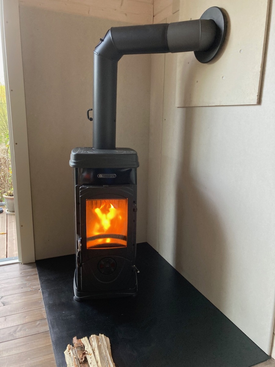 Der Ofen bzw das Zubehör dafür hatte lange auf sich warten lassen. Überall gibt es ja derzeit Lieferengpässe, so auch in diesem Bereich. Nachdem der Ofen erst mal unangeschlossen ein paar Wochen lang im Haus stand, kamen irgendwann die bestellten Ofenrohre. Nur die Halterungen dafür nicht. Also hatte Peter erst mal improvisiert bis die eigentlichen Schellen kamen. Mittlerweile sitzt alles bombenfest, nichts wird heiß, der Kamin zieht gut und das Öfchen macht das Haus einfach richtig gemütlich!